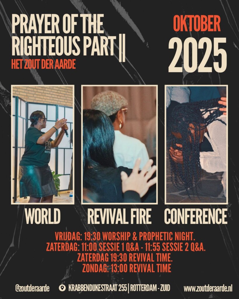 ARE YOU READY? 0 Krabbendijkestraat 255, R’damVrijdag 19.30 uur – Profetische WorshipZaterdag 11.00-11.45 Church Workshop Sessie 1Zaterdag 11.55-12.40 Church Workshop Sessie 2Zaterdag 19.30 Revival timeZondag 13.00 Revival time 'World Revival Fire Conference 17-19 oktober 2025' Days : Hours : Minutes : Seconds Get ready to experience a powerful outpouring of the Holy Spirit at the World Revival Fire Conference! "The effectual fervent prayer of a righteous man availeth much". James 5:16 17-18-19 oktober 2025